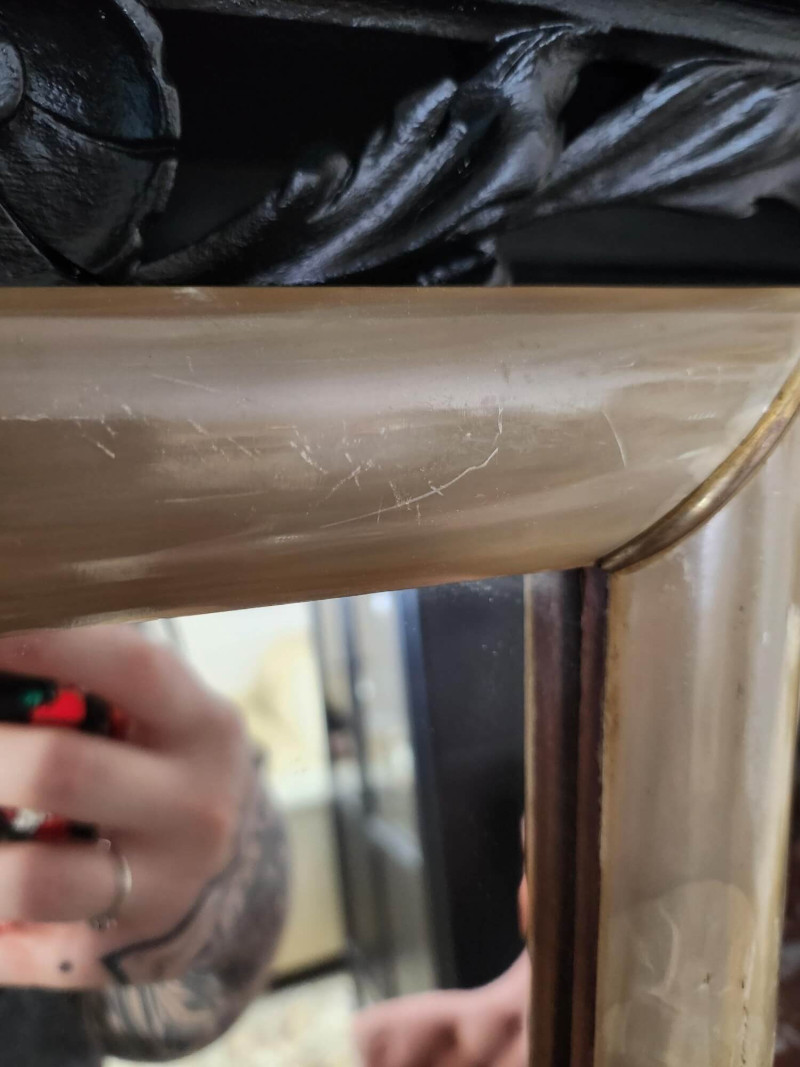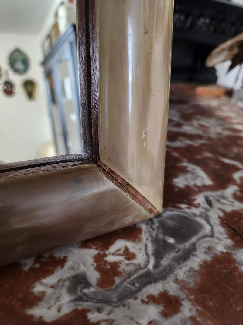 Miroir avec contour effet corne, style élégant et intemporel Ce miroir rectangulaire, d’un style épuré, possède un contour qui imite l’apparence de la corne, probablement réalisé en résine. Les angles sont ornés de détails dorés qui ajoutent une touche raffinée (il en manque un dans un coin voir photo) Idéal pour une décoration classique ou éclectique, il peut être posé sur un meuble ou accroché au mur (prévoir un système d’attache, car celui-ci n’en dispose pas à l’arrière). Le miroir présente quelques légères égratignures, discrètes et n’altérant pas son charme. Parfait pour compléter un espace avec une pièce chic et discrète !