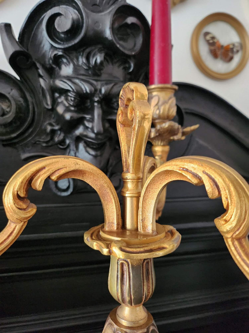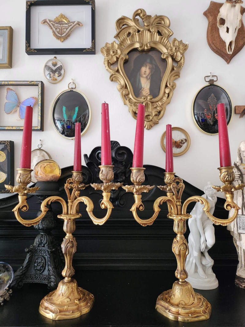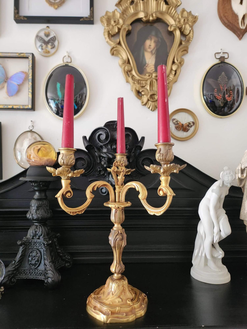 Magnifique paire de chandeliers anciens à trois bras chacun, entièrement réalisés en laiton massif. Leur poids impressionnant de 2,555 kg chacun (près de 5 kg la paire) témoigne d’une belle qualité de fabrication et d’une manufacture robuste et soignée. Leur ligne baroque richement ouvragée, aux volutes élégantes et motifs floraux, leur confère une allure noble et théâtrale. Avec leurs bougies rouges, ils dégagent un charme romantique et ténébreux, parfait pour une ambiance château, gothique ou vampire chic. Quelques légères traces d’oxydation du laiton soulignent leur authenticité et leur patine du temps, sans altérer leur beauté ni leur stabilité.